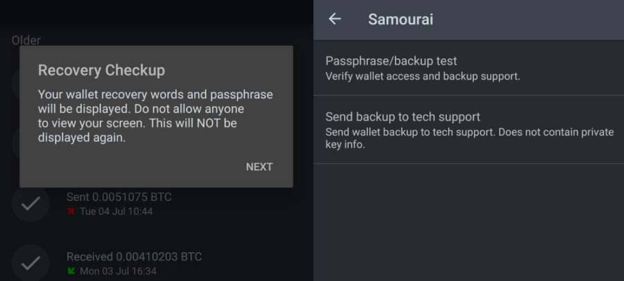 There is one additional function of the Samourai related to backups that is different from nearly every other Bitcoin wallet, and that’s the ability to test your backup phrase to ensure it works properly.