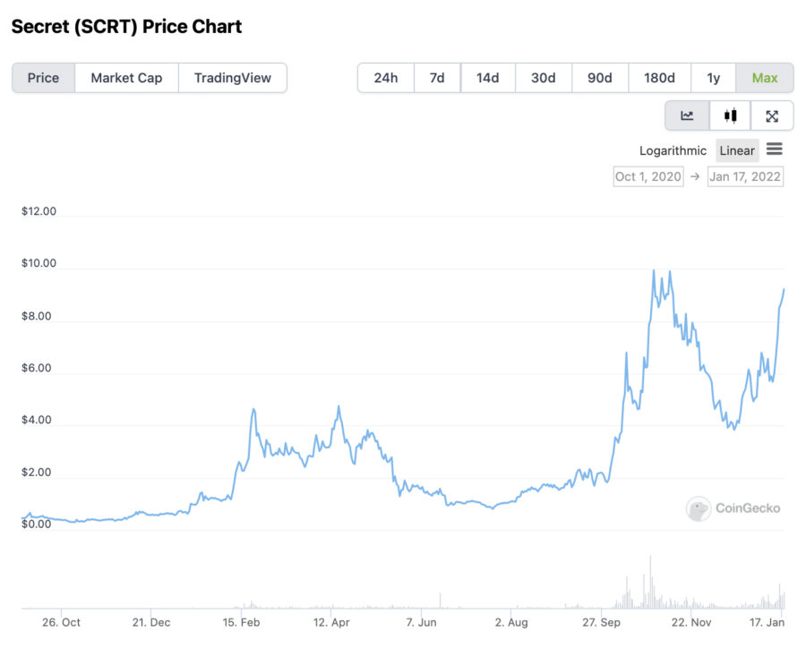 From less than $1 to $9 Image via Coingecko The price of SCRT has seen a pretty meteoric rise from its humble beginnings of about 50 cents to an all time high that almost touched the $10 mark in Oct 2021. Given that the Secret Network is still in the early developmental stages of the project, SCRT could continue to see some positive price action in the coming months (not financial advice).