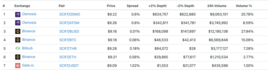 If you are looking to get your hands on some SCRT, your best bet is Binance. The trading volume is fairly decent and if you play it safe, can offer some good gains. Gate.io is also a good consideration for USDT pair. If you're a DEX fan, you can give Osmosis a try by doing a paired trade wth ATOM.