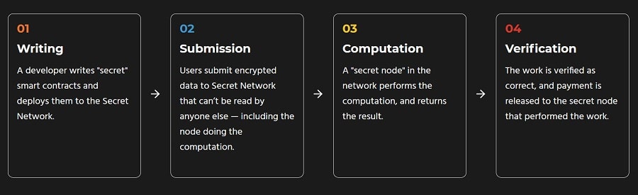 Secret Network is the first cryptocurrency blockchain to offer completely private smart contracts. This means that all smart contract inputs and outputs are completely encrypted. Transactions made on Secret Smart Contracts cannot even be viewed by the nodes running the Secret Network blockchain.