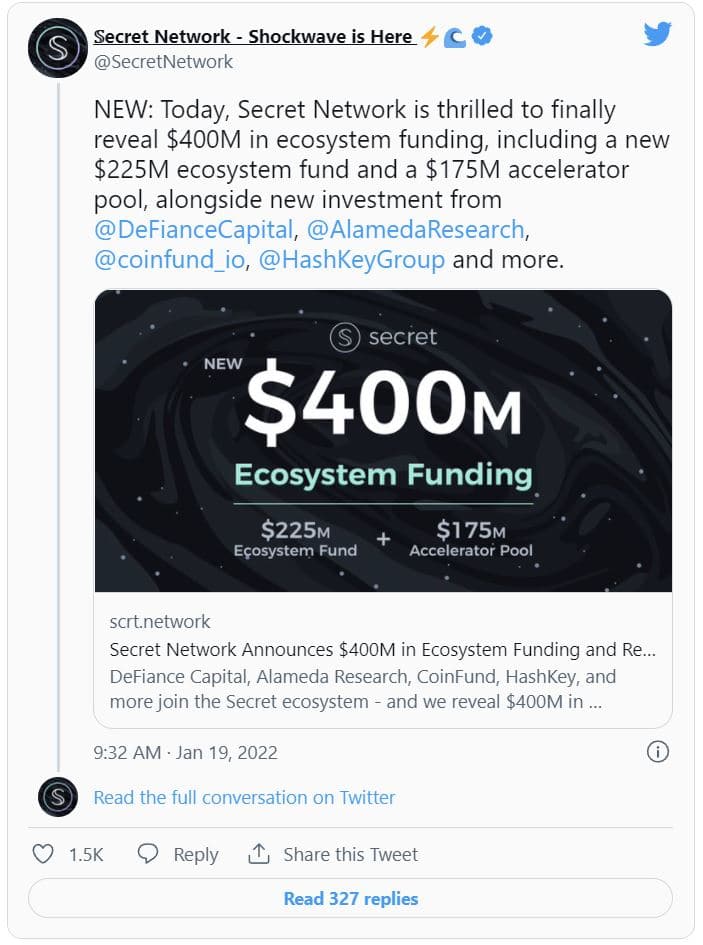 Deep pockets indeed. Image via TwitterThis announcement continues the Shockwave growth initiative, establishing Secret Network as the data privacy hub for Web3. The ecosystem fund is led by SCRT Labs and features contributions from 25 orginasations, including: DeFiance Capital, Alameda Research, CoinFund, HashKey, Hashed, Arrington Capital, Dragonfly Capital Partners, Fenbushi Capital, Skyvision Capital, Blocktower Capital, Terraform Labs, Hartmann Ventures, NGC Ventures, Figment, Arkstream Capital, Shima Capital, Magnus Capital, Bison Fund, Momentum6, Arca, Iconium, Huobi Ventures, Kucoin Labs, and Skynet Trading. Developers around the world are now invited to join Secret in their mission, and to build the next generation of Secret Apps that will protect and empower millions of global users. They pledge to support and mentor participants at every stage.