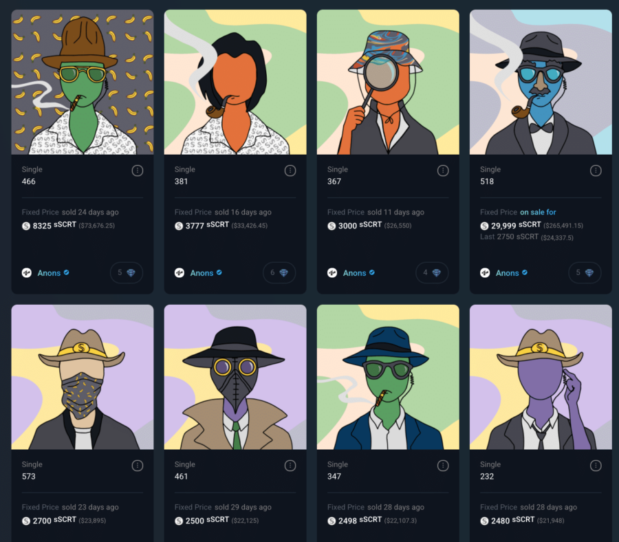 Why we need Secret NFTs Once you've gotten some Secret NFTs, head on over to Stashh, Secret Network's own NFT marketplace, to get some privacy-enabled NFTs. One of their more popular collections is Anons, where each NFT is a faceless person. The floor price is about $10,400 going all the way up to $73,000.