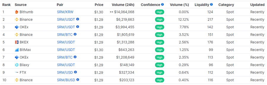 SRM market pairs. Image via CoinMarketCap Note that the 24-hour volume of SRM has declined significantly in recent weeks. This could lead to some increased volatility, so trade wisely!
