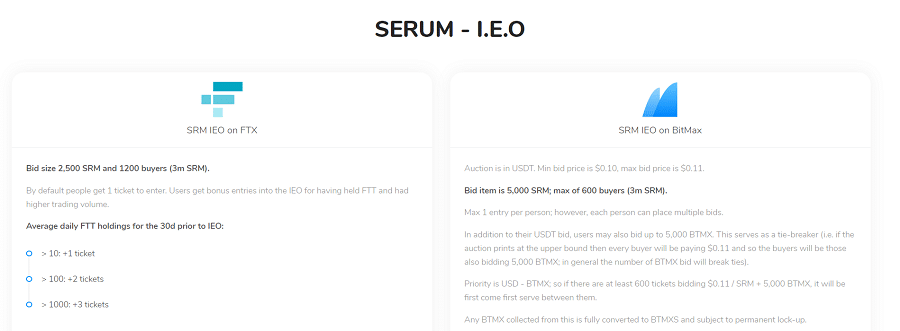 Project Serum hosted two simultaneous initial exchange offerings (IEOs) for the SRM token on August 11th, 2020. These took place on the FTX and BitMax cryptocurrency exchanges. Each exchange sold 3 million SRM at a price of roughly 0.11$USD per token. With 6 million SRM sold in total, 660 000$USD was raised. KYC was required for both IEOs and a cap of 1800 participants was set between both exchanges.