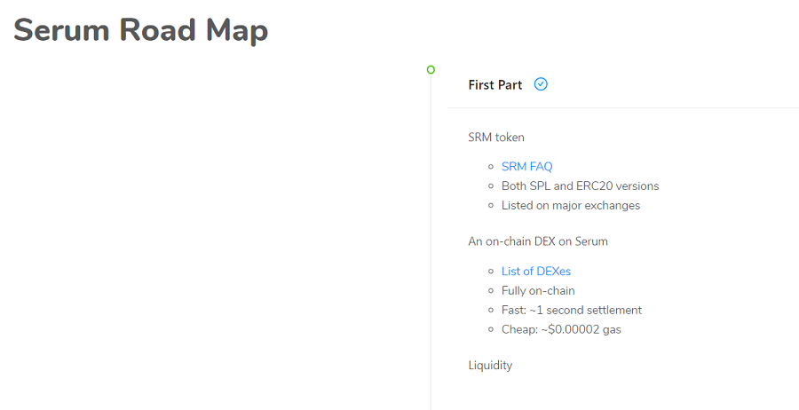The roadmap for Project Serum appears to be divided into five parts. Parts one and two have already been completed. Part one involved launching the Serum token and the Serum DEX. Part two involved building a cross-chain bridge, opening the door to third party DEX development on Solana, and introducing ecosystem grants for promising projects related to Serum.