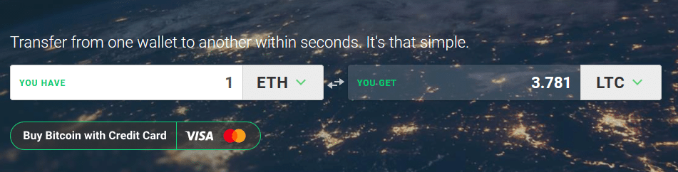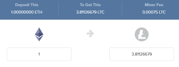 A completed ShapeShift exchangeLet's say, for example, that you want to exchange some Litecoin for some Ethereum. You open the ShapeShift website, choose your desired cryptocurrencies, and choose if you want to exchange a specific amount or a non-specific amount.