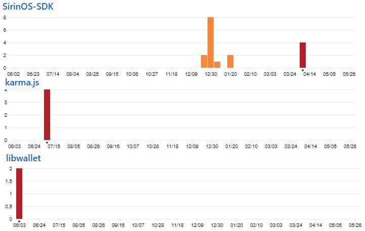 Therefore, I decided to dive into the Sirin Labs GitHub and observe the level of activity that they had going on there. Below are the total commits to their three most active repos in the past year.