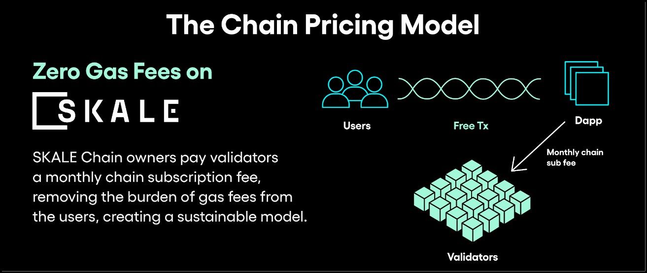 - Zero-Cost Transactions for Users: One of the standout features of SKALE Chains is that transactions are zero-cost for end-users. Validators are compensated for processing transactions from the subscription fees collected, eliminating the need for users to pay gas fees when interacting with DApps on SKALE Chains.