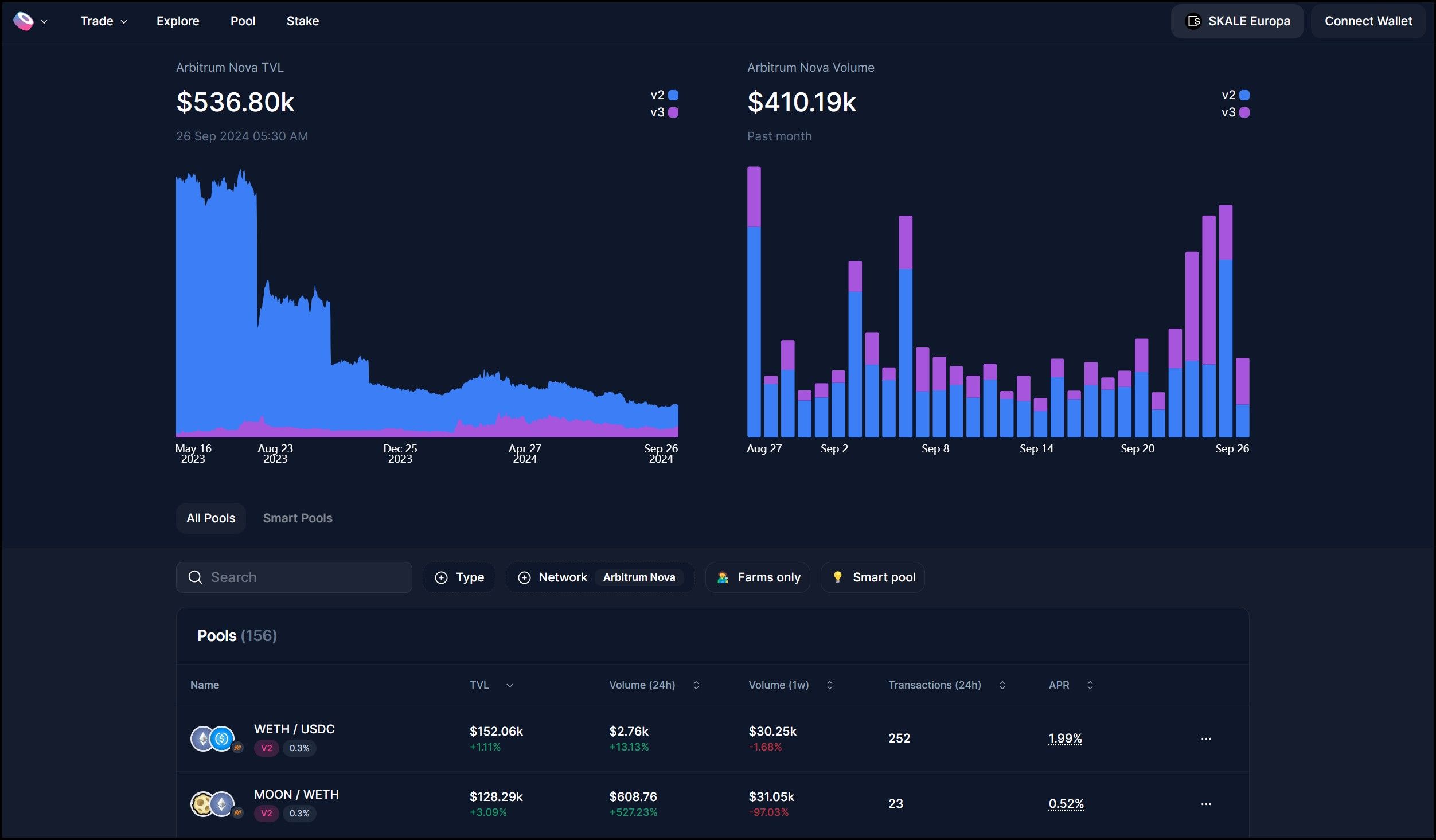 SushiSwap V3 Also Supports SKALE Europa | Image via SushiSwap SushiSwap, a well-known decentralized exchange (DEX), has deployed its V3 version on the Europa Hub of the SKALE Network. By leveraging SKALE's high throughput and zero-gas transactions, SushiSwap V3 on SKALE offers users faster and cost-effective trading experiences. This integration enhances liquidity and provides traders with seamless access to DeFi services.