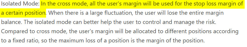 When it comes to the "Cross" mode, all of the user's margin will be used for a stop loss margin for a particular position. So, if you have a certain amount of margin in your account and a trade goes against you then that margin can be used.