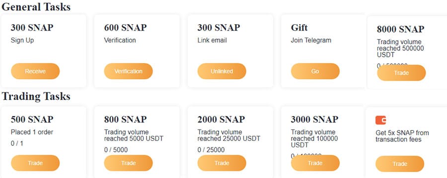 You can think of SNAP Points as VIP points that are earned for completing a number of tasks on the SnapEx platform. These include the likes of signing up, and verification of an email address. You can also earn some SNAP just from simple trading tasks like placing your first order, trading over 5,000 USDT, 25,000 USDT etc.