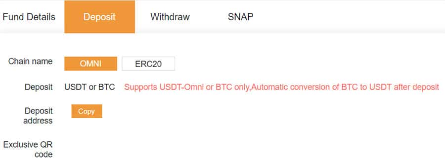 Generating a SnapEx Deposit AddressHere you will either select "OMNI" or "ERC20". Take note that if you are depositing Bitcoin or Tether OMNI then you will select the "OMNI" option. If, however, you are depositing a newer ERC20 Tether variant then you will have to select that.