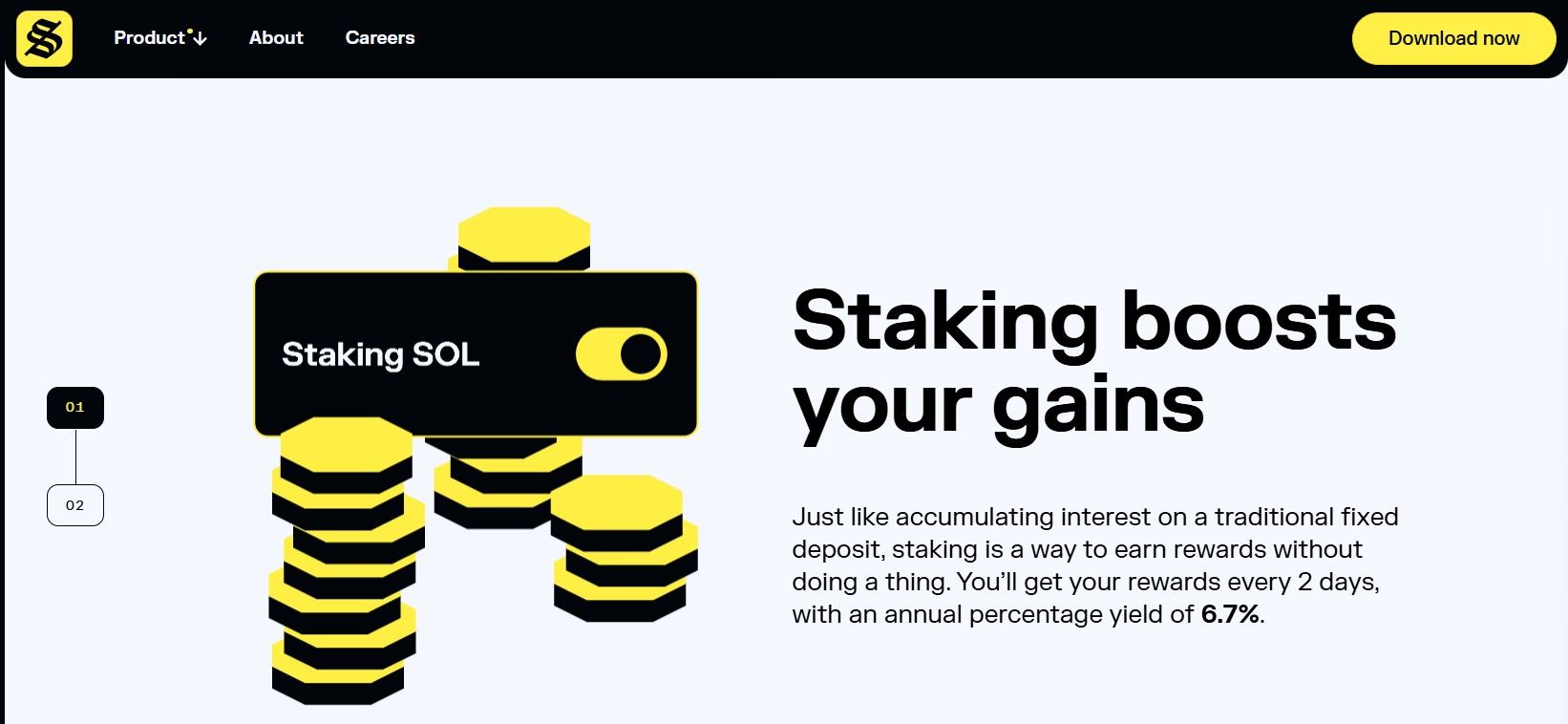 - The Solflare website claims a 6.7% APY on SOL staking, with rewards distributed every two days, aligned with Solana epochs.