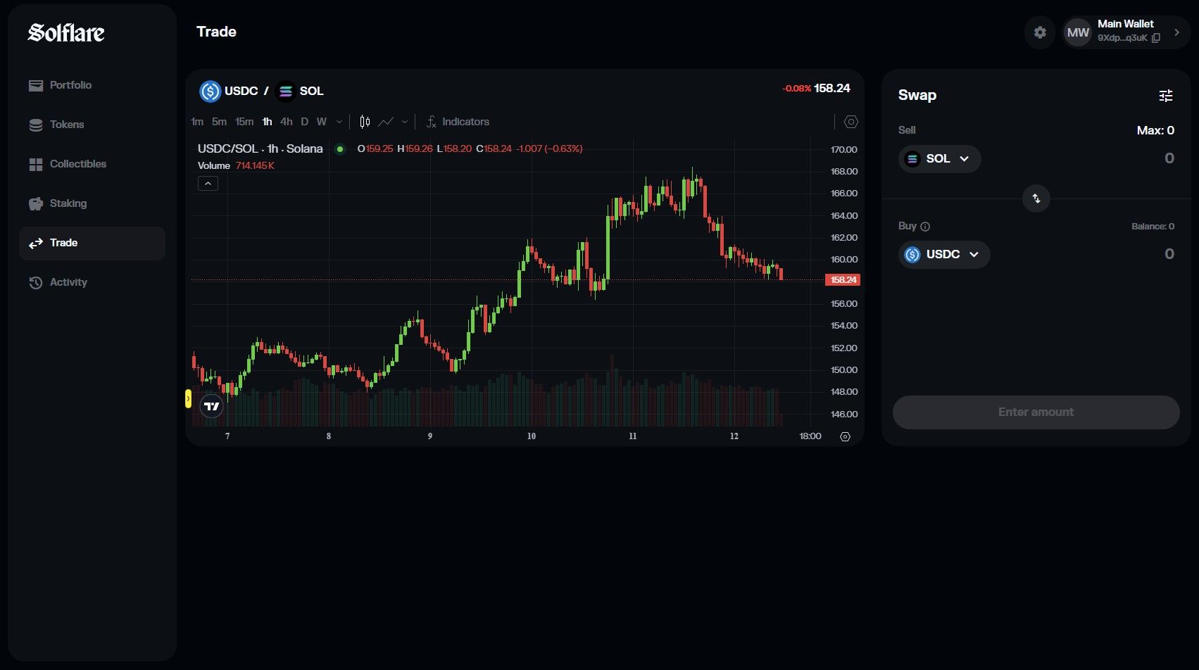 There’s no extensive UI customization — no themes, layout adjustments, or dashboard widgets to tinker with. Customization is mainly limited to the candlestick charts in the Trade tab, where you can toggle time frames, chart types (candlestick, line), and enable basic indicators. Beyond that, Solflare keeps the interface lean and distraction-free.