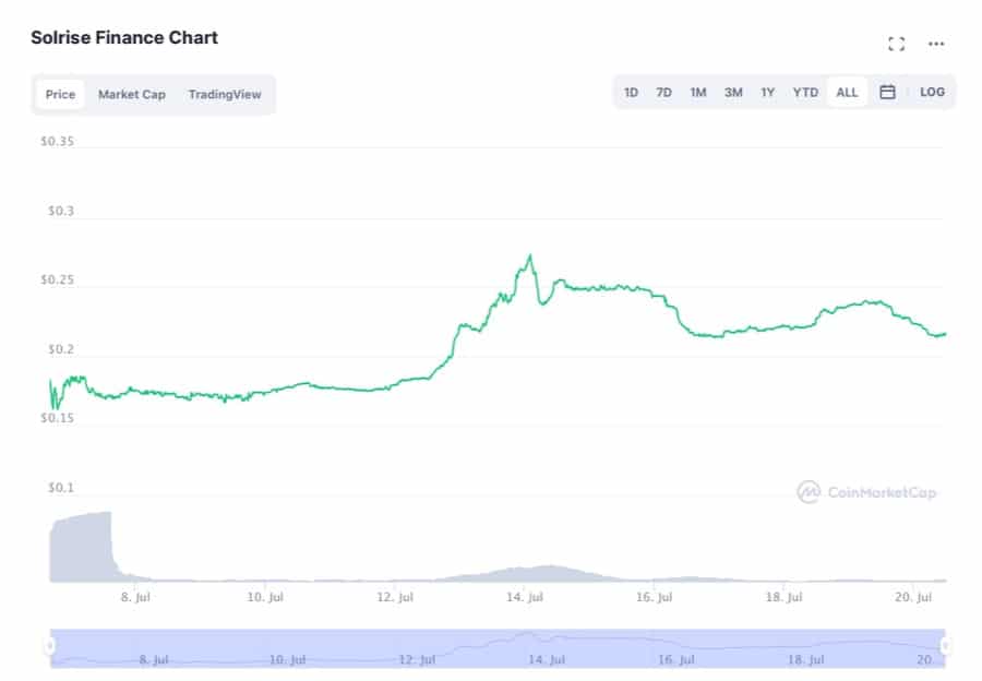 In terms of price, the SLRS token is currently trading at $0.22 and peaked at an all-time-high of $0.2736 on July 14th 2021. The Solrise token currently holds a market capitalisation of approximately $8.5 million and there are 37,174,010 SLRS in circulation out of the total 1 billion tokens in existence.