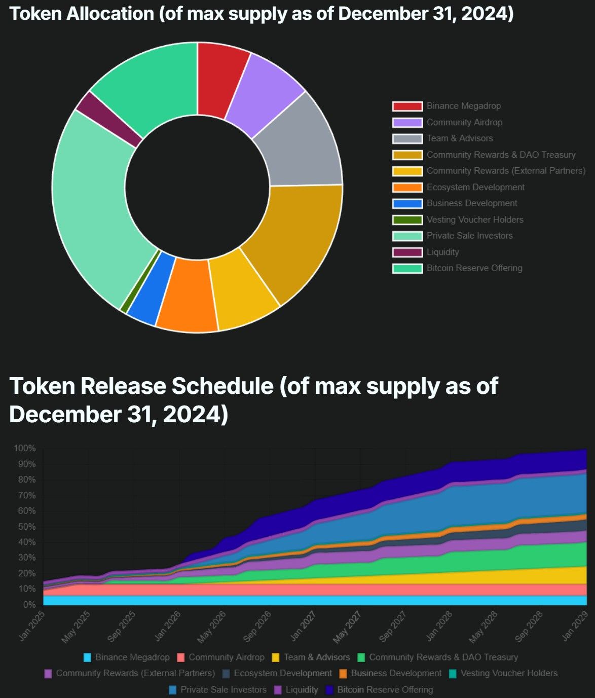 Notably, 13.04% of the maximum supply is allocated for the Bitcoin Reserve Offering, which was not part of the initial genesis supply.