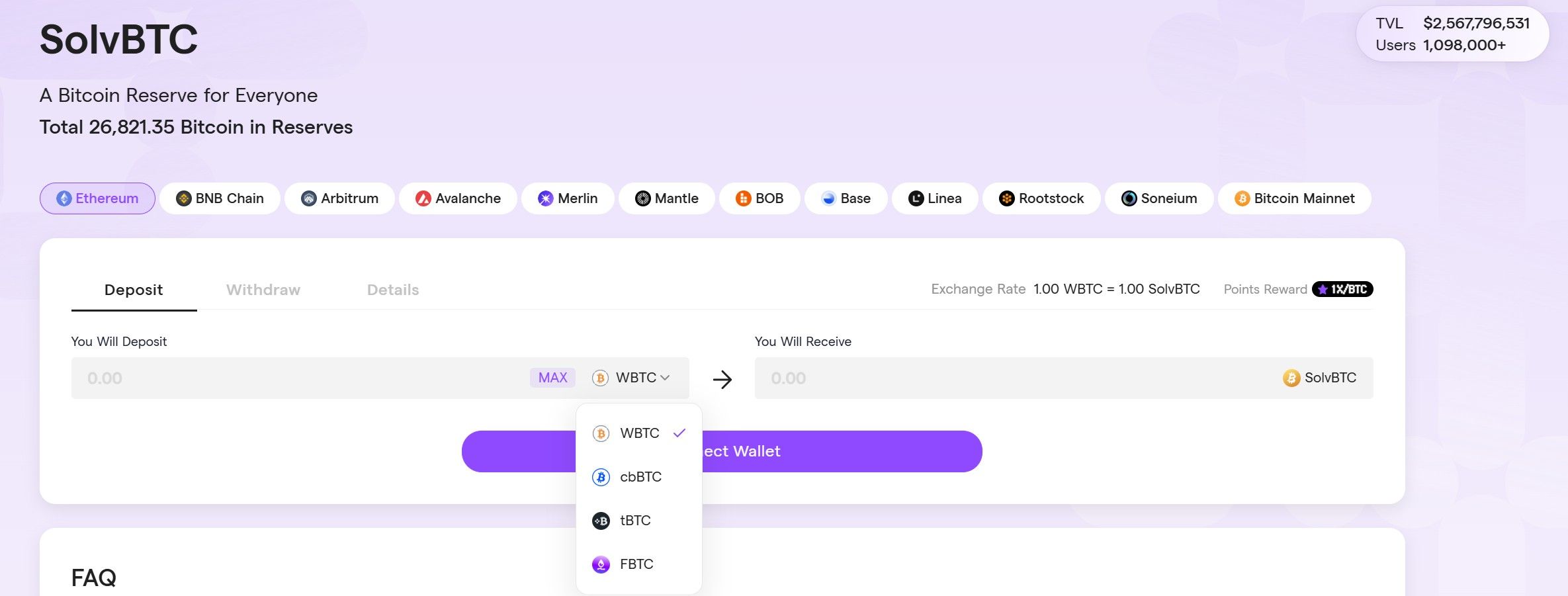 - Minting SolvBTC: Users can mint SolvBTC by depositing existing wrapped Bitcoin tokens, including WBTC, cbBTC, tBTC, and FBTC, through the Solv Protocol application. This process consolidates various wrapped Bitcoin assets into a single, more versatile token.