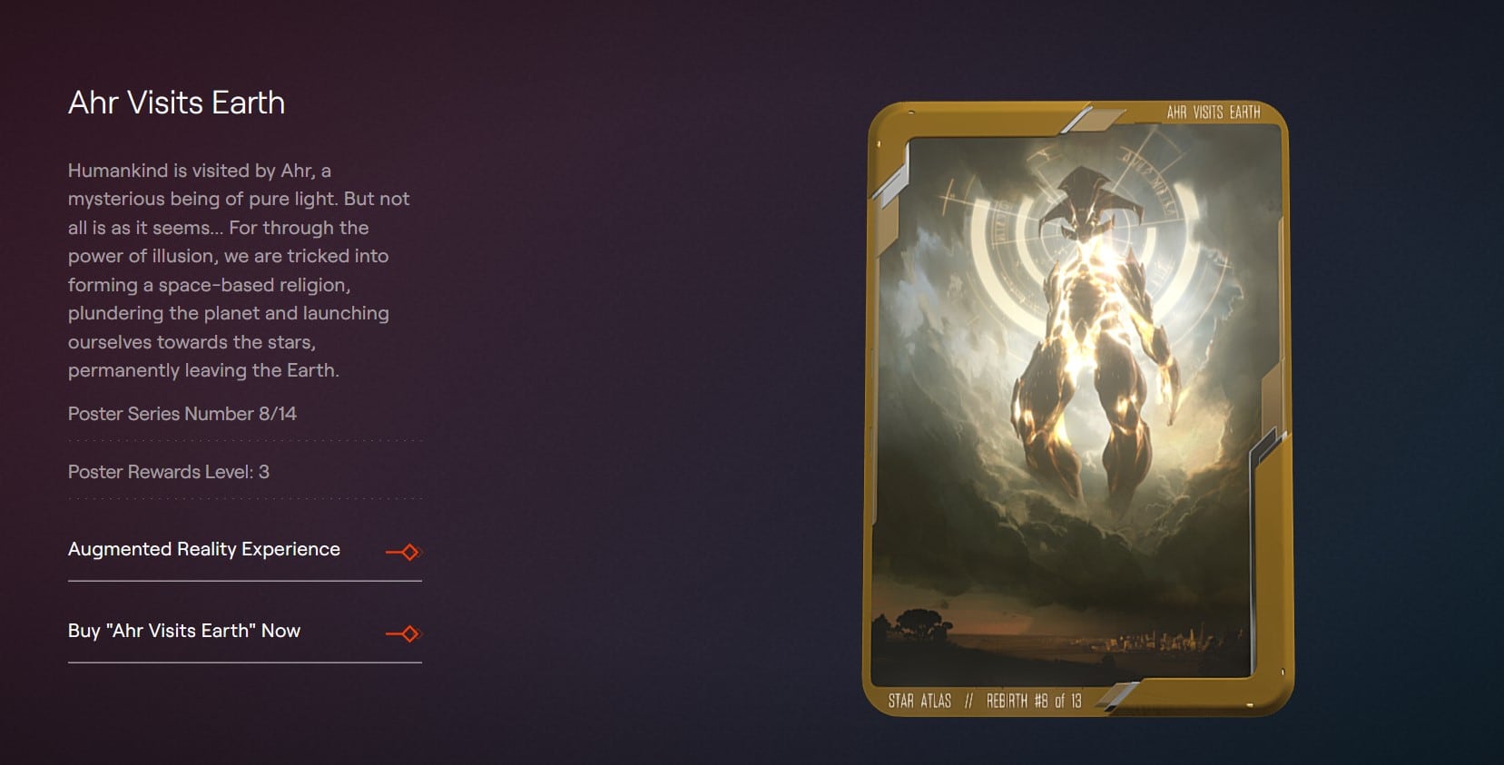 One of the AR Poster NFTs Released Image via Star Atlas Some in-game items such as Spaceships, posters, and characters are already being traded on the Star Atlas marketplace, which will be ever-expanding and evolving to meet the growing needs of the Star Atlas universe.