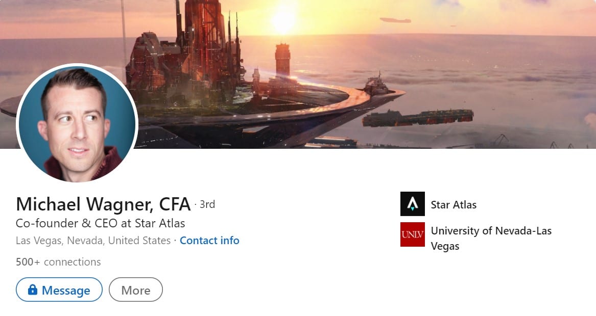 Image via Linkedin The CFA certification is no small accolade, nor is it easy to achieve. This certification comes with strict ethical guidelines for proper business and investment practices which is one of the reasons that many early investors have the confidence to back Star Atlas. The fact that Michael is a public figure, is very open and transparent in multiple interviews and holds a certification of high calibre has given investors confidence that this project isn’t likely to be a rug pull or flop dead.