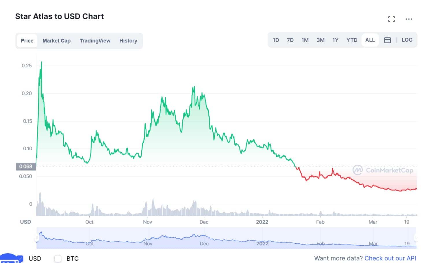 The ATLAS token had an initial sale offering price of $0.00138, then a public launch price of $0.068 and quickly shot up well over 1,500%, reaching an all-time high of just over $0.25, then came crashing back down as early investors took profit. The ATLAS token has seen struggling price action along with the rest of the crypto market amidst uncertain macroeconomic times.
