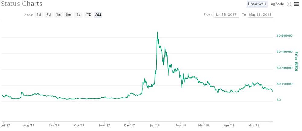 Initially trading at $0.05 when first listed in July 2017, SNT is currently priced at $0.96628 as of May 2018, for a nearly 100% return in less than a year. It has been a wild ride though, and the SNT token traded as high as $0.65 in December 2017 before dropping throughout much of 2018 as the overall crypto markets suffered a bear market.