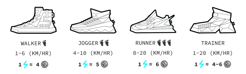 However, which kind of sneaker to get? Well, let's look at the breakdown of a sneaker. First is sneaker categories: Walker, Jogger, Runner and Trainer. Despite the fact that each type of sneaker gives you a different earning rate, the price of the sneakers are based more on the attributes than their earning capabilities. This means that the floor price of a Runner can be the same as a Walker.