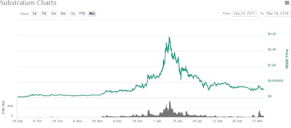 Substratum Price Performance. Image via coinmarketcap.comThe price of the tokens has fallen considerably over the past few weeks which is in line with the general cryptocurrency markets. The SUB tokens are still up considerably from the ICO token price of about $0.08.