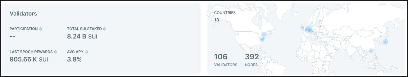 - Sui network runs on 392 nodes, of which 106 are full node validators participating in DPoS consensus.