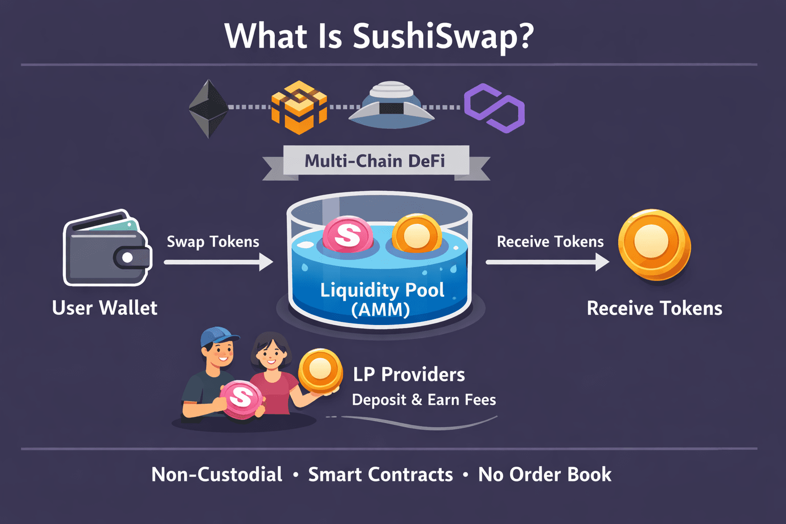 - Not a centralized exchange (CEX): SushiSwap does not custody user funds or operate order books. All activity happens through smart contracts, executed directly from user-controlled wallets on public blockchains.
