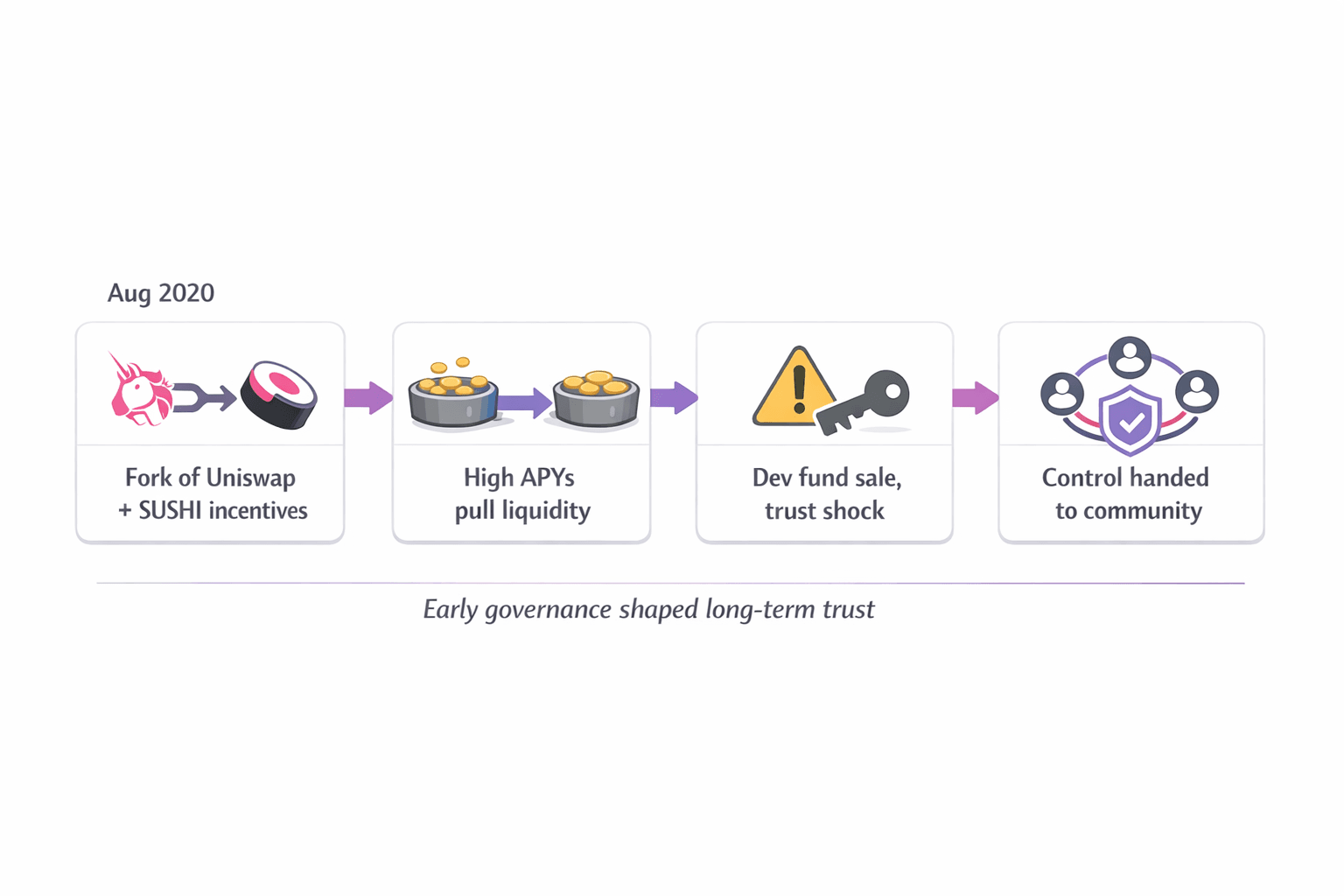 SushiSwap’s early months combined explosive growth with governance turbulence. Laying this out chronologically makes it easier to see how trust, control and decentralization evolved.
