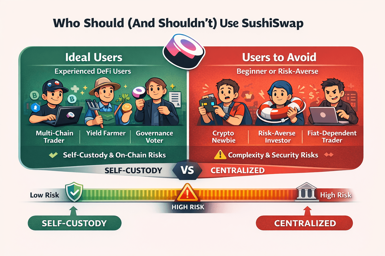- Ultra Risk-Averse Investor: Expects FDIC-style protection, reversibility, or guaranteed recovery. Smart contract risk, impermanent loss, and MEV exposure mean SushiSwap offers no safety net for conservative capital.