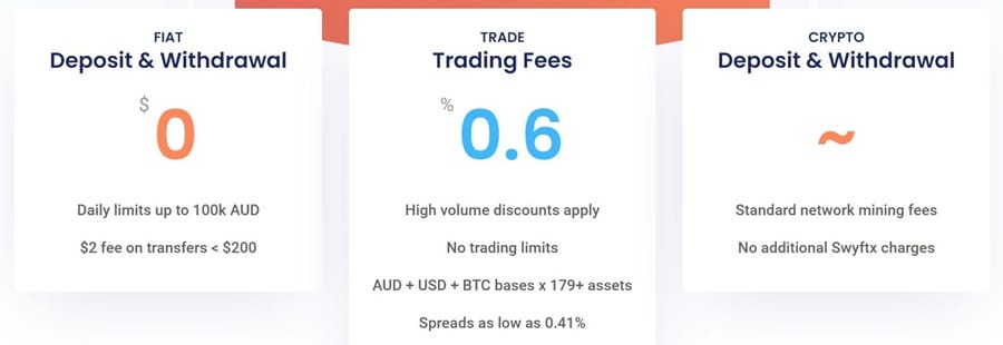 Swyftx solves this liquidity issue in a couple ways. We’ve already discussed how they look among a number of other exchanges to find the best liquidity and spreads. In addition to that they convert all AUD deposits to USD and vice versa when funds are withdrawn. That’s why the fee looks so high at 0.6%. It’s actually a forex conversion fee. However by doing this they are able to keep their spreads far lower than other exchanges.