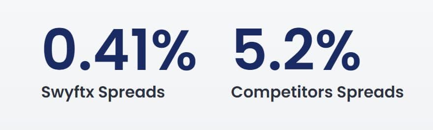 Incredibly low spreads. Image via Swyftx.com.au They can offer such low spreads because of the proprietary algorithm that finds the lowest possible spread every time for every trade. And when you put together the fee and spread, which can be as low as 1.01% at Swyftx, you soon see that they have the best cost structure out there.