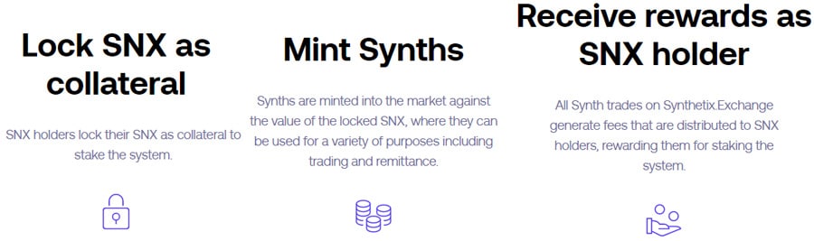 SNX tokens power the entire Synthetix ecosystem, since they are used as collateral to mint the Synths, or synthetic assets. Those who hold SNX tokens can stake them and earn a portion of the fees generated by the Synthetix Exchange.