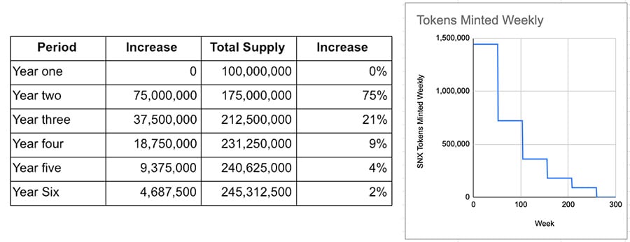 SNX Inflation Schedule. Image via Synthetix BlogThe inflationary policy includes increasing the number of SNX tokens from 100 million in March 2019 to 260,263,816 by August 2023. The issuance of new tokens decays at a rate of -1.25% per week. After the supply reaches the August 2023 goal the protocol shifts the issuance rate to a fixed 2.5% inflation rate in perpetuity.