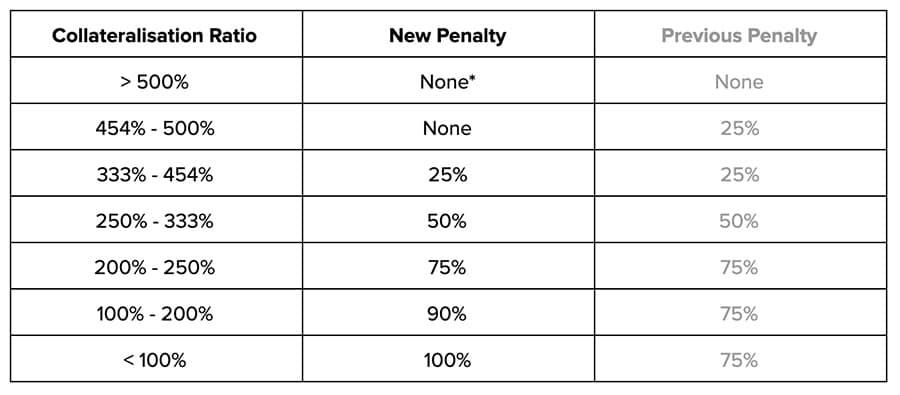 Penalty Schedule for Under CollateralisationAs each transaction on the exchange takes place the exchange fees are transferred to a pool. This pool is then distributed among SNX stakers in proportion to the amount of outstanding debt they hold. In this way anyone can increase the amount of staking fees they earn by simply issuing more Synth.