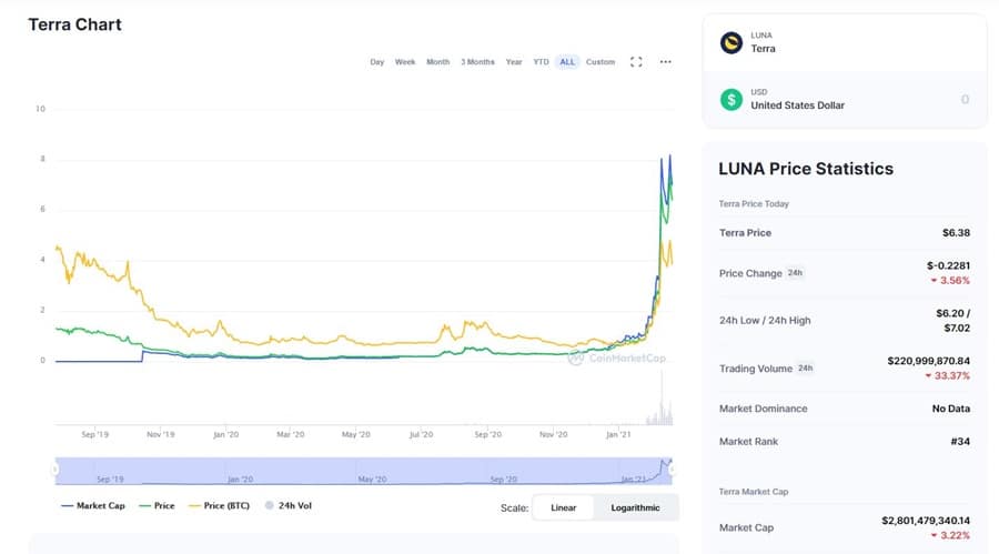 The price history of LUNA. Image via Coinmarketcap.com. December 2020 saw the token begin climbing higher in the altcoin rally that lifted markets broadly. As of February 19, 2021 the LUNA token is still tracking higher, and is trading at $6.39. That is off the all-time high struck the previous day at $7.52.