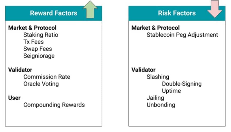 Users can stake LUNA tokens for rewards. Image via Terra blog. Staking rewards are distributed first to network validators, who take a small commission for themselves before passing along the rewards to individual delegators. The size of those rewards are determined by the size of the stake. They also increase as the transaction volume in the network increases, since part of the staking rewards come from transaction fees.