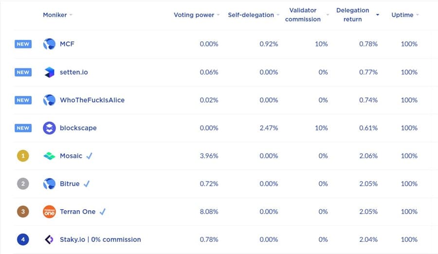 A list of LUNA validators for delegating at Terra Station. Only the top 100 validators with the most weight will be active validators. If validators double-sign, or are frequently offline, they risk their staked Luna (including Luna delegated by users) being "slashed" by the protocol to penalize negligence and misbehavior.