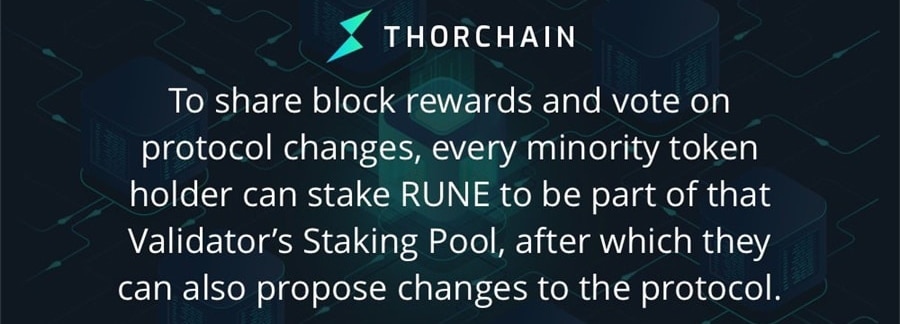 Providing decentralized governance. Image via Twitter. In addition the maintaining the network and receiving rewards, staking also conveys voting rights on THORChain. These rights extend to governance changes, on-chain commands, token structure changes, state changes, architecture changes, and changes to consensus rules.