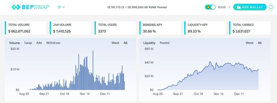 BEPSwap is the first stop on the road to Asgardex. Image via Bepswap.com Launched in beta in September 2020 BEPSwap has grown to several thousand users and roughly $10 million in daily trade volume. Small still, but it is a beta project and also warns users not to stake or add large amounts of liquidity. Still, with a bonding APY of almost 30% it is an attractive alternative to lending, yield farming, or traditional bank accounts.