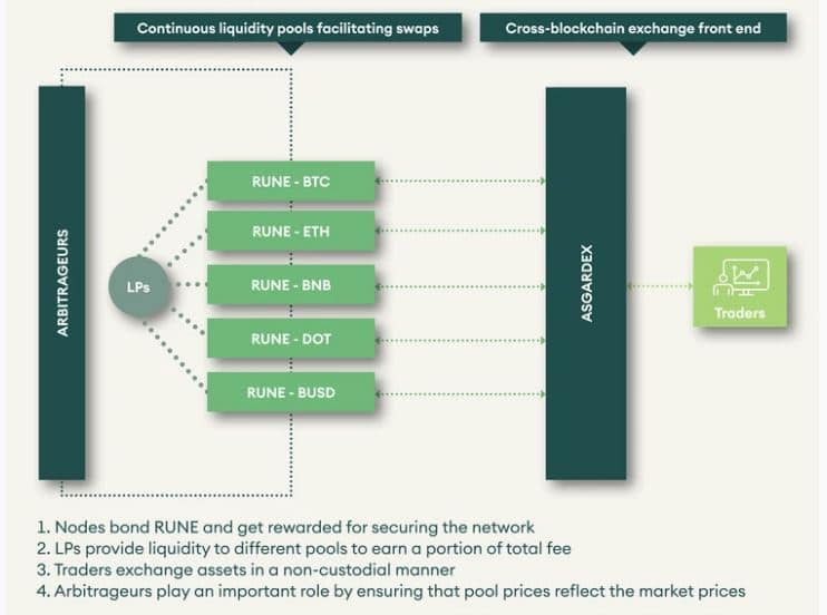How THORChain works. Image via THORChain Docs The network was created around incentivizing the provision of liquidity and safety through staking and bonding. The notion of liquidity pools is certainly nothing innovative by itself, yet there are currently only a small number of underutilized liquidity pools.