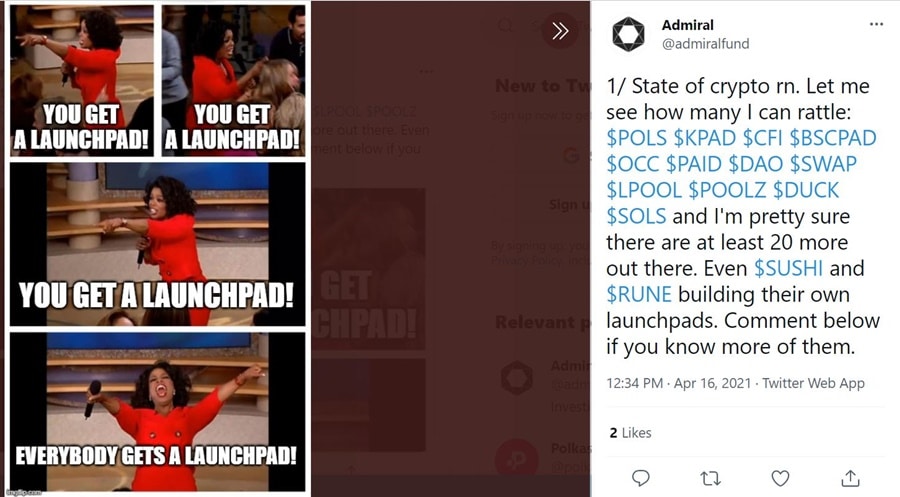 Everyone gets a launchpad! Image via Twitter. The crypto audiences on Youtube and Twitter are understandably reaching a level of burnout when it comes to launchpad IDOs. The launchpads have responded by turning to non-crypto influencers on both platforms as a way to continuing promoting their projects, tapping into niches like music, fitness, sports, gaming, and others as a way to find more retail investors to bring into the ecosystem and keep the capital flowing like champagne.