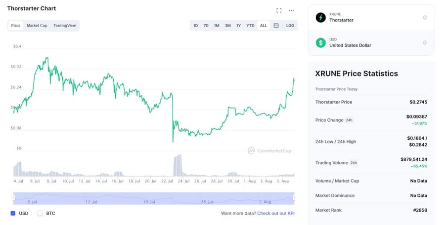 The XRUNE token is pretty new, having launched in early July at a price just below $0.15. A week-long rally more than doubled that price to just over $0.36. However price then began to slide lower and by the end of July was down to the $0.065 level.