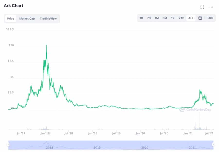 Ark Is Currently Down 90% From Its ATH Of $9.99 - Image via CoinMarketCapAt the time of writing, the Ark token is trading at approximately $1, a 10x away from its all-time-high. If ICO investors were to cash in their Ark tokens now, they would walk away with a 10,000% return on their original investment.