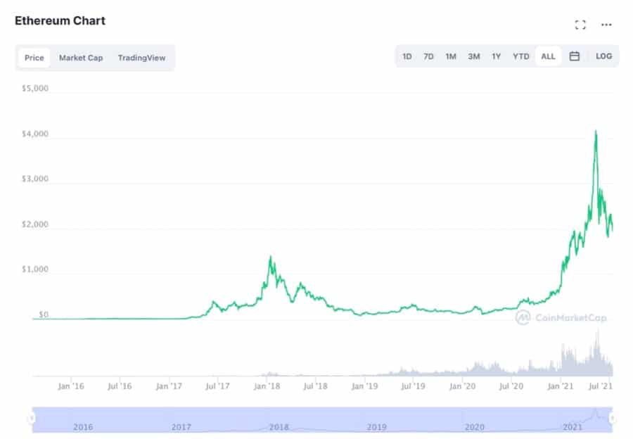 ETH Has Been Rapidly Climbing Since Its ICO Price Of $0.311 - Image via CoinMarketCap At the time of writing, ETH is trading at $2,030 and the token peaked at a staggering all-time-high of $4,362.35 on May 12th 2021. While Ethereum is currently down approximately 53% from its ATH, early-stage investors who purchased the token at ICO for $0.311 are up over 6,000x on their initial investment. However, those who managed to sell ETH at its all-time-high of $4,362.35 would have gained over 14,000x ROI, a mind-blowing 1,402,600% gain!