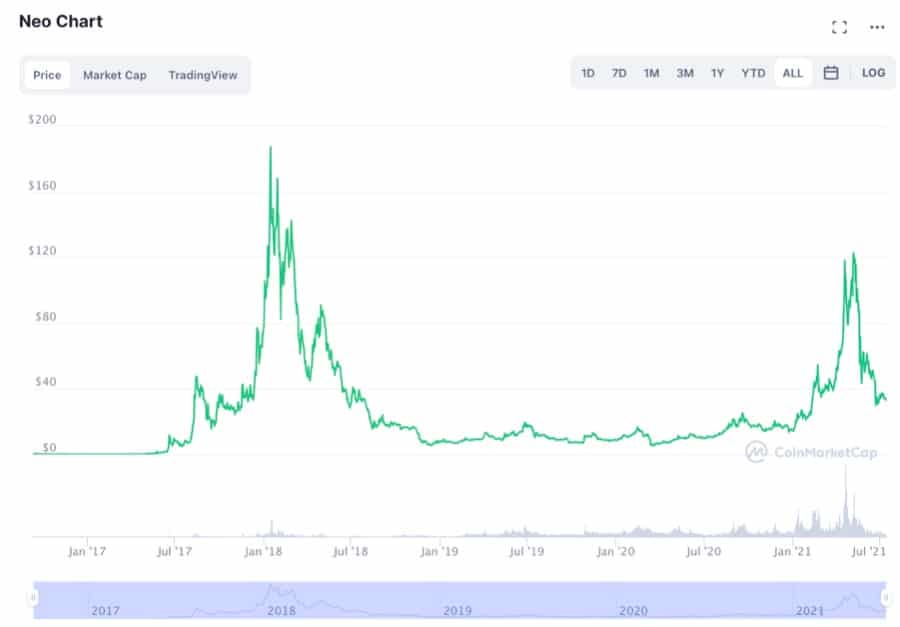 Neo Has Remained Relevant Throughout Both The 2017 And The 2020-2021 Bull Markets - Image via CoinMarketCap The original ICO price of the Neo token was $0.032 and now, at the time of writing, the token is trading at around $33 which is already a 1000x away from its ICO price. However, more interestingly, Neo peaked at an all-time-high of $196.85 on January 15th 2018, returning investors over 600,000% ROI.