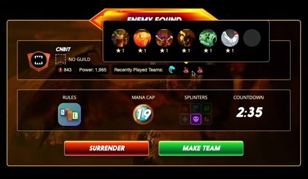 Splinterlands Opponent Match Screen Showing Recent Decks Used and Opponent’s Power Once you have chosen your cards and the countdown has reached zero, the battle now begins where each player is taken to a screen to watch how the battle will play out. It is good to mention here that the players do not actually participate in the literal battle, once the cards are chosen and the strategy has been put into place by each opponent, the duel itself is played out in auto-play format where each player watches the duel play out.