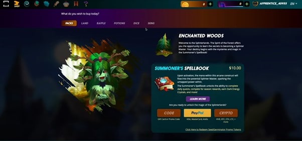 Splinterlands Summoners Spell Book Purchase Screen Image via Hive.blog Which will set you back $10 dollars. This purchase can be made with crypto or PayPal and once you have made this purchase, all of the features of the game such as purchasing cards and using some in-game features will be made available.