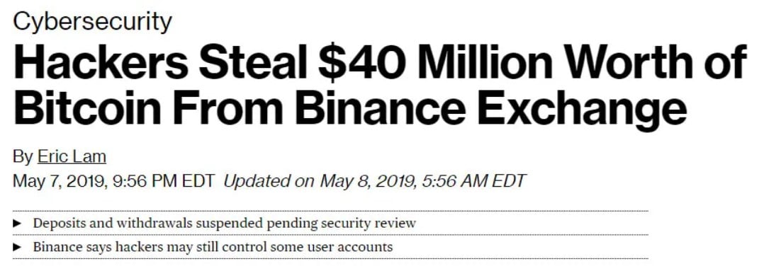 Binance Hack of $40m- Good Reason not to Keep Funds on an Exchange Image via BloombergBenefits of a Software Crypto Wallet